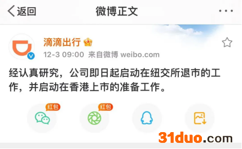 12月3日,滴滴出行通过官方微博宣布,经认真研究,公司即日起启动在纽交所退市的工作,并启动在香港上市的准备工作。