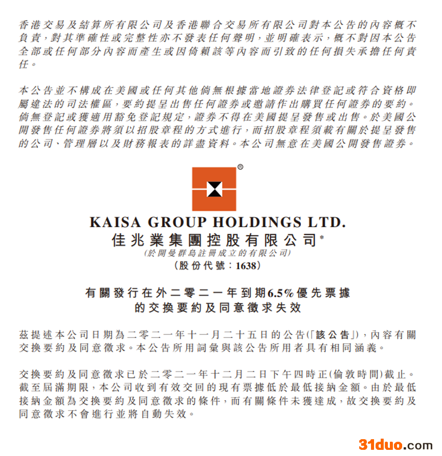 佳兆业集团周五公告称,该公司2021年到期的6.5%优先票据交换要约及同意征求失效。截止12月2日下午4时(伦敦时间),佳兆业收到有效交回的现有票据金额低于最低接纳金额。由于最低接纳金额为交换要约及同意征求的条件,而有关条件未获达成,故交换要约及同意征求不会进行并将自动失效。