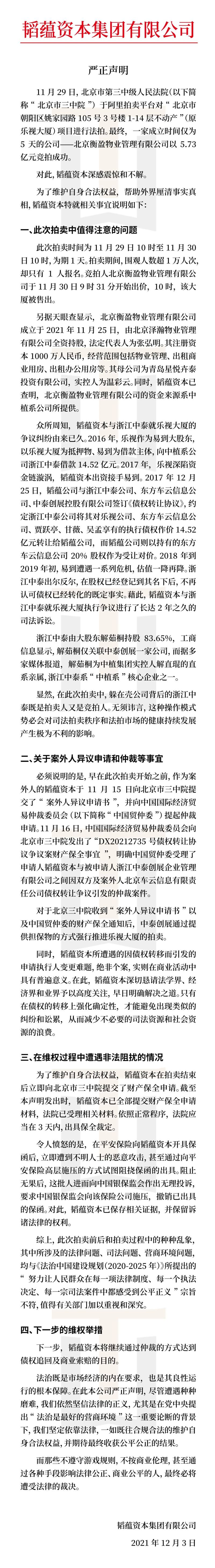 蓝鲸TMT频道12月3日讯,今日,易到用车官方微信公众号发布声明称,11月29日,北京市第三中级人民法院(以下简称“北京市三中院”)于阿里拍卖平台对“北京市朝阳区姚家园路105号3号楼1-14层不动所(原乐视大厦)项目进行法拍。最终,一家成立时间仅为5天的公司--北京衡盈物业管理有限公司以5.73亿元竞拍成功。对此,韬蕴资本方面表示,为了维护自身合法权益,帮助外界厘清事实真相,就相关事宜做出说明。并指出,将继续通过仲裁的方式达到债权追回及商业索赔的目的。