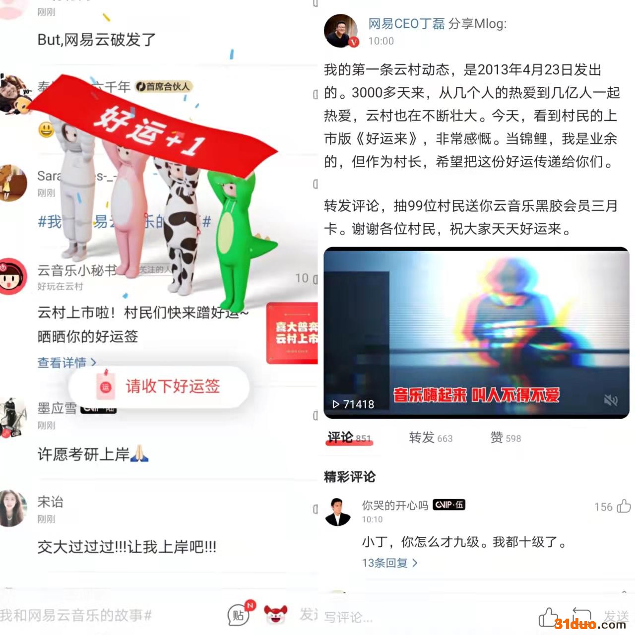网易云音乐的英文名直接用了社区“云村”的名字,叫“Cloud Village”;今日的上市仪式上,丁磊不但派了两个分身“丁磊2000”与“丁磊2021”,与自己一同参加“元宇宙”上市大会,一大早还抽空在云村里写下上市感言小作文,称自2013年4月23日发出第一条云村动态后,已经过去3000多天,这期间云村从几人的小村落扩大到几亿人,作为村长要把好运分享给村民,转发评论抽99名村民送网易云音乐3个月会员卡。