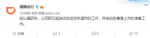 滴滴出行微博3日早间发布消息称,经认真研究,公司即日起启动在纽交所退市的工作,并启动在香港上市的准备工作。 ????