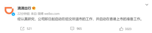 12月3日早间,据微博@滴滴出行消息称,经认真研究,公司即日起启动在纽交所退市的工作,并启动在香港上市的准备工作。