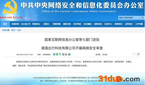 据中国网信网,网络安全审查办公室7月16日发布消息,网络安全审查办公室有关负责同志表示,按照网络安全审查工作安排,7月16日,国家网信办会同公安部、国家安全部、自然资源部、交通运输部、税务总局、市场监管总局等部门联合进驻滴滴出行科技有限公司,开展网络安全审查。