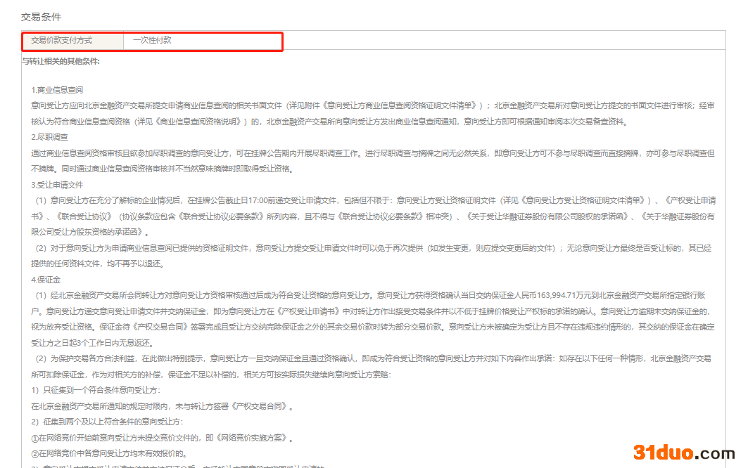 金交所周五披露此次受让方资格及交易条件,要求意向受让方应向交易所提交其商业信息,及配合完成尽职调查;且此次付款方式须一次性付款,须为自有资金,不得以借贷资金或他人委托资金入股。
