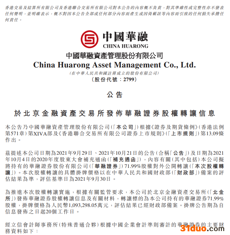 截止截至2021年9月30日止9个月,华融证券的营业收入约为8.026亿元,营业利润约1.11亿元,净利润8586.18万元。净资产的账面价值为100.576亿元,净资产的评估价值约为134.408亿元,增值率33.6%。