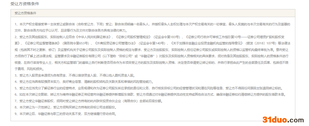 华融方面还要求,受让方在受让华融证券股权时,须同时受让转让方持有的杭州翀宋投资合伙企业(有限合伙)全部劣后级份额。