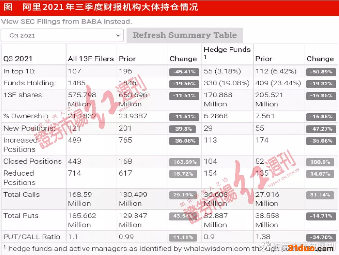 相比桥水等大幅买入,其他机构的态度则明显不同。观察阿里2021年三季度财报机构汇总信息,当季13F申报人持股相比前一季度下降45.41%,对冲基金的这一数值则下降50.89%。