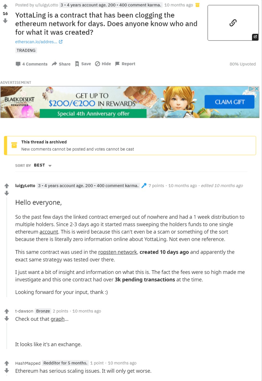 gyLotto(发帖和评论上千次)抱怨说YTL单一合约就造成了以太坊上3000笔交易被堵塞。
