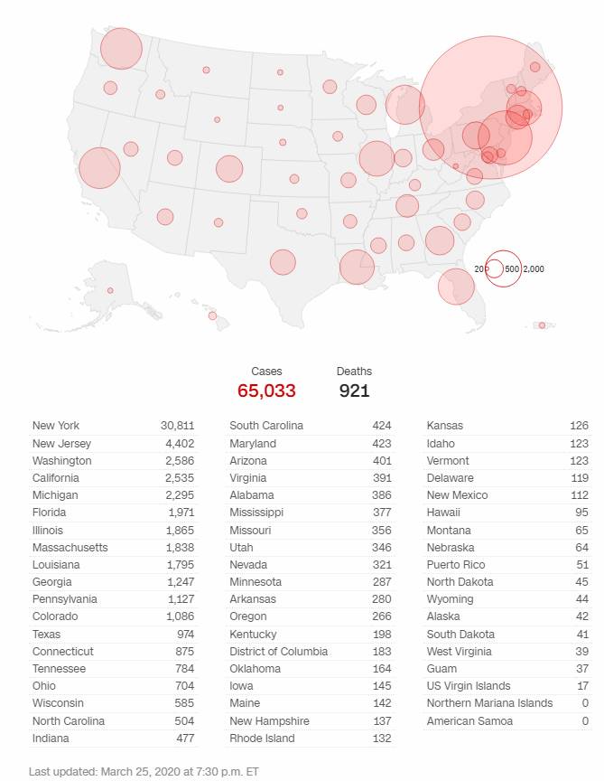 根据CNN统计,截止美国东部时间3月25日晚7点30分,全美报告新冠肺炎确诊病例65033例,较昨日新增12305例,死亡921例,较昨日新增228例。