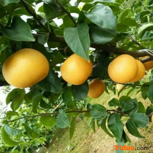 果实大,近圆形,果形端正,果肩平,果形指数0.9,平均果重350克,大的可达800克。不套袋果皮黄绿色,套袋后变为金黄色,故名“黄金梨”。果实套袋后,果皮极洁净,金黄色,呈透明状,外观极其漂亮。果肉乳白色,果心小,可食率95%以上;肉质细嫩,果汁丰沛,石细胞极少,味纯甜且具香气,品质极好。耐贮运,货架期22天,冷藏可贮6个月。在重庆地区8月上中旬成熟,在华北9月中旬成熟,是一个优良的中熟梨品种。由于该品种外观华丽,品质佳,对管理水平要求较高,也是目前发展快、市场售价高的梨品种之一。该品种生长势强,树姿较开张,一年生枝绿褐色,叶特大而厚,卵圆形或长圆形,叶缘锯齿锐而大,嫩梢叶片黄绿色,这是区别于其他品种的重要标志。当年生枝和叶片无白色茸毛,这是与二十世纪梨(亲本)的明显区别。腋花芽结果能力强(但果形欠端正),花芽肥大,花粉极少。早果丰产性佳,次年亩产可达500千克,第三年亩产可达1500千克以上。对黑星病、黑斑病抗性强,适应性广。