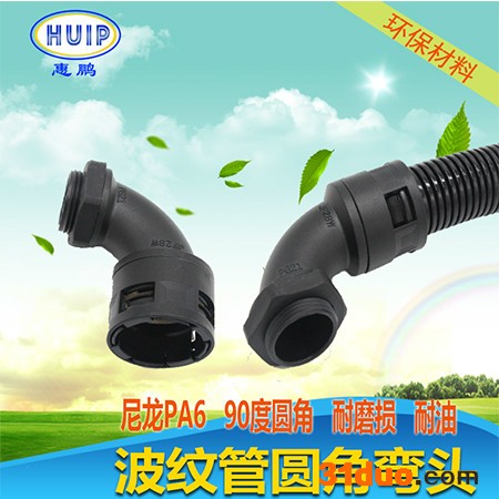 90度圆角 穿线更便捷 耐油耐酸防腐蚀 全新环保产品材质:尼龙(polyamide)螺纹规格:德制螺纹(PG)公制螺纹(M)工作温度:-20~+110℃防护等级:IP66,使用适合的密封圈颜 色: 黑色,其他颜色可以定做使用方法:90度圆角塑料波纹软管的配套产品,可接入设备箱体上,也可根据选用螺纹接入进出口为内螺纹的电动设备上,只需将塑料波纹软管插入接口即可。产品优势:防水,防尘