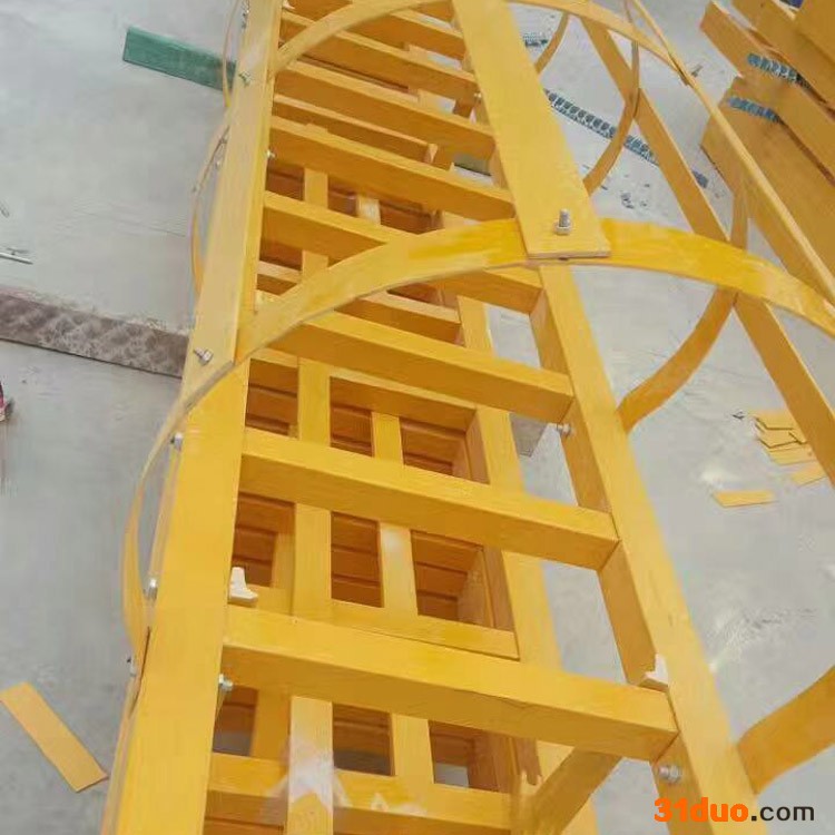 是采用玻璃钢**玻璃钢拉挤型材,通过一定装配工艺制成。玻璃钢爬梯拥有爬梯 的大部分特性,但也有其显著的不同之处,玻璃钢爬梯重量轻且安装方便无需焊接,玻璃钢爬 梯耐腐蚀性强不会生锈,长期使用无需维护降低费用。玻璃钢爬梯颜色鲜艳美观,无须外部装 饰自成一景。