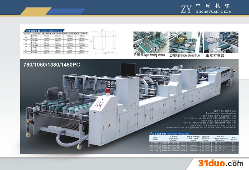 全自动高速糊盒机 产品说明: 全自动高速糊盒机采用双面牙杆调整机构,适用于不同规格制盒,操作简便。 上糊筒左右两处装置,适合底贴、两侧边贴使用。 下糊筒左右两处装置,便于特别盒型使用。 采用光电计数器定量计数,自动踢板装置作标记。 附加成品横送装置,便于成品收集。 动力传输采用强力时规皮带,高效率、低噪音、易保养。 采用变频高速电机,PLC控制系统,原装进口元器件。 操作迅捷简便,初学者易掌握。型号功能适用纸质糊盒速度所需电力机械尺寸机械重量折返方式ZY-1000二折边贴卡纸、卡裱卡酒盒,裱E瓦彩盒MAX.300M/min7.5KW, AC380VL10.0m*W1.80m*H2.0m4000 kg无ZY-1000S二折底贴卡纸、卡裱卡酒盒,裱E瓦彩盒MAX.300M/min11KW, AC380VL10.40m*W1.850m*H2.0m6200 kg无ZY-1000V四折边贴卡纸、卡裱卡酒盒,裱E瓦彩盒MAX.300M/min11KW, AC380VL12.5m*W1.85m*H2.0m6500 kg无折1800,第3线折1350ZY-1000W四折底贴卡纸、卡裱卡酒盒,裱E瓦彩盒MAX.300M/min11KW, AC380VL13.5.0m*W1.85m*H2.0m75001800,第3线折1350ZY-1100二折边贴卡纸、卡裱卡酒盒,裱E瓦彩盒MAX.300M/min7.5KW, AC380VL10.0m*W1.80m*H2.0m4300 kg无ZY-1100S二折底贴卡纸、卡裱卡酒盒,裱E瓦彩盒MAX.300M/min11KW, AC380VL12.0m*W2.10m*H2.0m6500 kg无ZY-1100V四折边贴卡纸、卡裱卡酒盒,裱E瓦彩盒MAX.300M/min11KW, AC380VL12.0m*W2.10m*H2.0m7000 kg线折1800折1350ZY-1100W四折底贴卡纸、卡裱卡酒盒,裱E瓦彩盒MAX.300M/min11KW, AC380VL13.0m*W2.10m*H2.0m8000 kg折1800,第3线折1350ZY-1380二折边贴卡纸、卡裱卡酒盒,裱E瓦彩盒MAX.300M/min11KW, AC380VL11.0m*W2.40m*H2.5m5000 kg无ZY-1380S二折底贴卡纸、卡裱卡酒盒,裱E瓦彩盒MAX.300M/min11KW, AC380VL11.4m*W2.40m*H2.5m8000 kg无ZY-1380V四折边贴卡纸、卡裱卡酒盒,裱E瓦彩盒MAX.300M/min11KW, AC380VL13.4m*W2.45m*H2.5m8500 kg1800,第3线折1350ZY-1380W四折底贴卡纸、卡裱卡酒盒,裱E瓦彩盒MAX.300M/min13KW, AC380VL14.4m*W2.45m*H2.5m9500 k00,第3线折1350