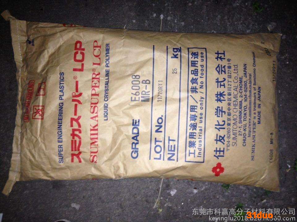 r 供应 LCP 日本住友LCP E5008高强度粘结性好耐温335度密度:1.69 g/cm3吸水率:0.02 %成型收缩率:0.06 %缺口冲击强度:88 拉伸强度:111 MPa断裂伸长率:4.8 %弯曲强度:127 MPa弯曲模量:12200 MPa硬度:89 热变形温度:335 ℃