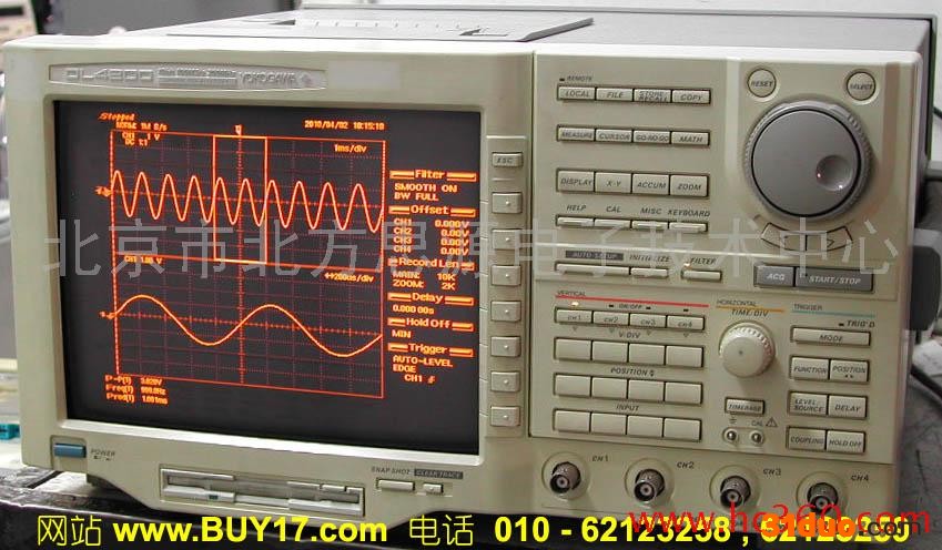 DL4200 带宽300MHz (DL4100 带宽150MHz)r全四通道 采样率100MSa/s 记录长度100k 通讯接口IEEE-488 本机自带热敏打印机rThe Yokogawa DL4200 oscilloscope is a graph-displaying device – it draws a graph of an electrical signal. In most applications, the graph shows how signals change over time: the vertical (Y) axis represents voltage and the horizo