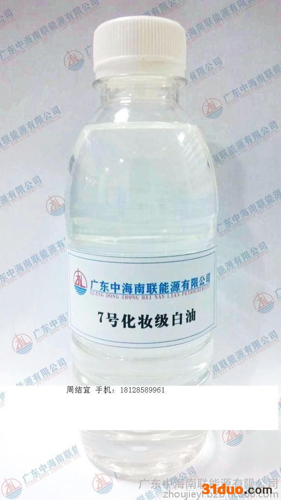 7号化妆白油是采用加氢原料经过超深度精制后得到的白色油。它的性能优点为不含任何添加剂水分和机械杂质。具有良好的防锈性、冷却性、润滑性和清洗性等四大功能。优异的抗紫外线和热安定性;具有良好的氧化安定性和化学稳定性;良好的抗磨性及抗腐蚀性。7号化妆级白油适用于化妆工业可作发乳、发油、唇膏、面油、护肤油、防晒油、婴儿油、雪花膏等软膏和软化剂的基础油。在橡胶行业中可作润滑剂脱模剂和增塑剂,可外用于纺织、机械、精密仪器的润滑以及压缩机密封和油墨加工等方面。