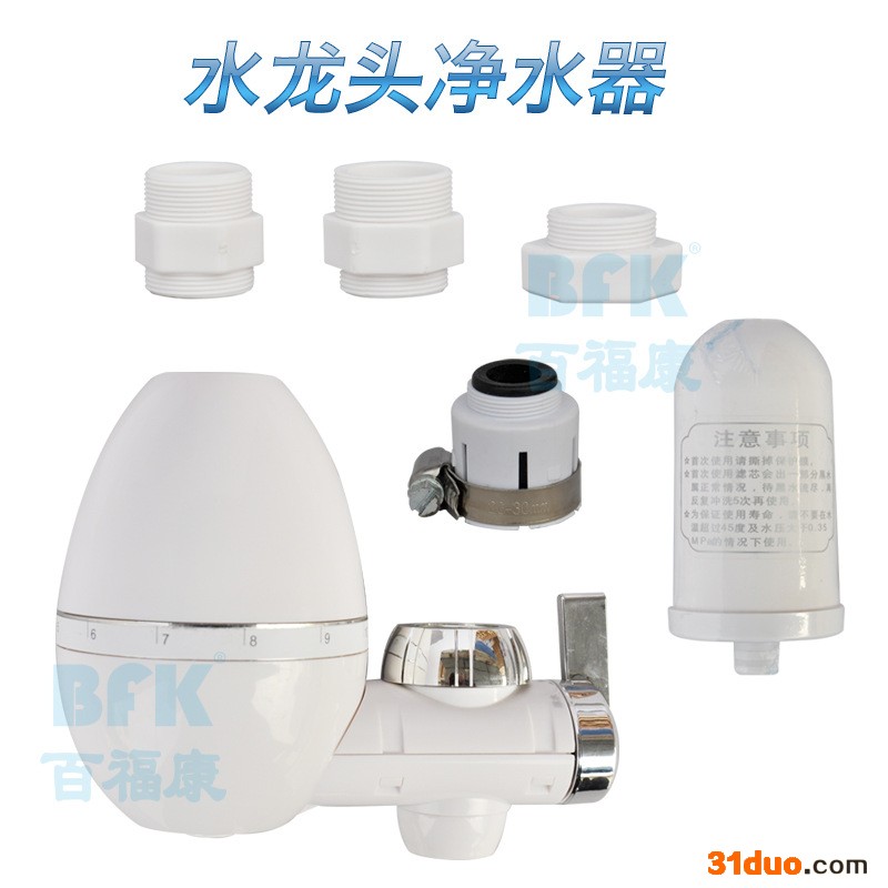● 产品参数 产品名称: 新款水**净水器 品 牌: BfK/百福康 滤壳材质: 食品级ABS塑料 内部滤料: 陶瓷 工作压力: 0.1~0.35MPa 温 度: 4~45℃ 流 量: 6L/min 适用水源: 市政自来水 使用寿命: 3~6个月 (根据实际水质水源更换) 产品通用率: ** 产品重量: 340g ● 产品介绍 水**净水器,滤芯采用**硅藻瓷为原料,经高温烧结而成,内置进口KDF等滤料,可完全滤除水中的铁锈、泥沙等大颗粒的杂质,有效去除水中的细菌、藻类,滤除大部分的余氯异味及有害的溶解性重金属离子(铅、镉、铬等),同时保留了人体所需要的矿物质和微量元素。 ● 产品用途 为您洗菜、淘米、煮饭、煲汤、泡茶提供安全、健康的饮用水,还可为您洗脸、刷牙等提供清洁卫生的洗漱用水。 ● 产品特点 ① 性能卓越 矽藻瓷质粒子极为细微,凝固后组成内部庞大的微小滤孔网络,能高效去除水中的悬浮物、胶体,并可滤除所有0.5微米的病菌,如大肠肝菌、霍乱菌、痢疾志贺氏菌、沙门氏菌、克雷白氏杆菌等,病源菌过滤比率高达99.999%。 ② 安全耐用 滤芯素烧过程令瓷质坚硬,能抵受强大的压力及腐蚀,滤孔不会变形,可重复清洗再用,无须经常更换。 ③ 天然清纯 滤芯采用天然的矽藻化石精制而成,不含化学成份,过滤后水质天然清纯,无需煮沸,随时供应清纯、甘甜开口及保留矿物质之即时饮用水。 ④ 环保节能 纯物理过滤方式,利用自来水压力提供过滤动力,为免外加动力型净水器,不用电能。 适用于家庭、宾馆、酒吧茶楼、办公室等生活饮用水。