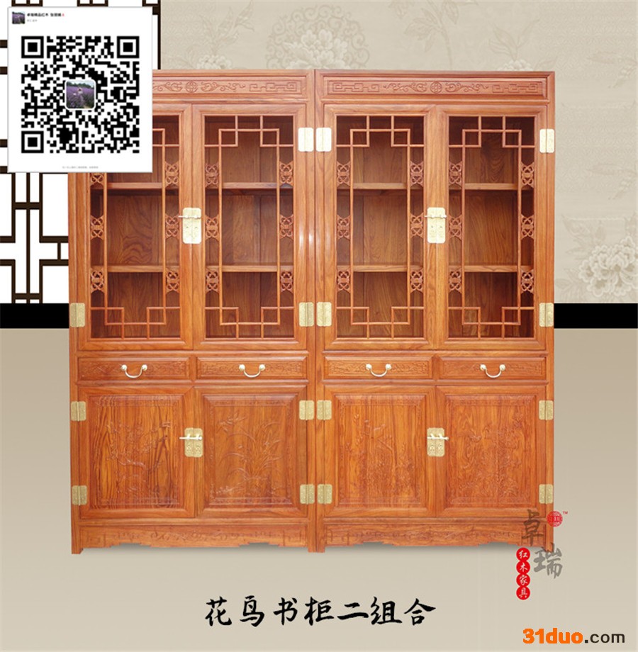 东阳红木家具工厂直销?低价促销 产品名细 【名称】花鸟书柜二组合 【结构】精雕 榫卯精巧手工工艺 【材质】缅甸花梨木(大果紫檀) 非洲黄花梨 【颜色】原木色/金黄色/金黄色偏红/老红木色等,也可按照客户要求上色。 【产地】浙江省东阳市--中国木雕城 【包装】汽泡+纸板 【周期】现货1-2天发货 【运费】到付 【规格】 216*100*38