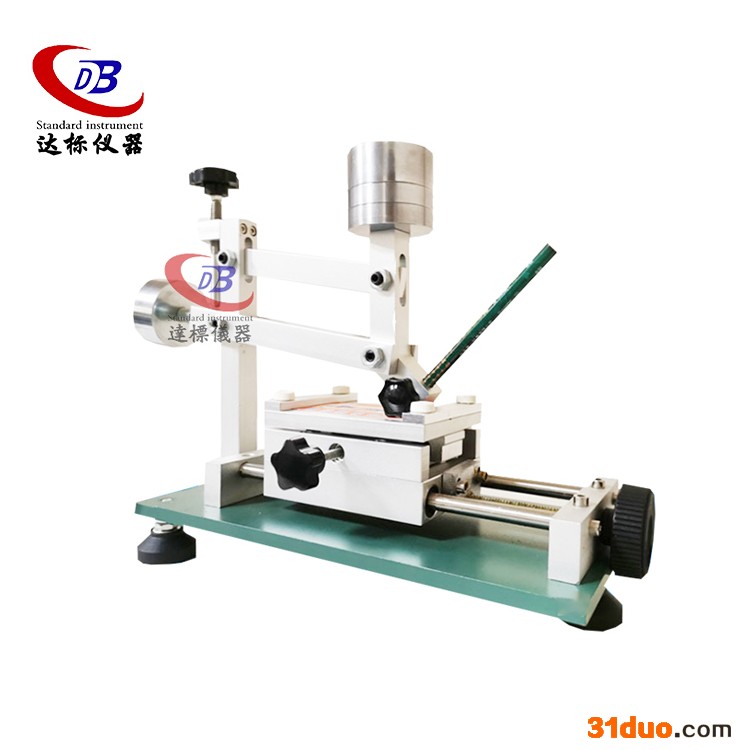适用于检测油漆领域的硬度,具体应用于金属涂层,装饰 材料,合成皮革等。 原理: 铅本仪器主要由铅笔架和试验台组成,铅笔架与立柱等组成四连杆结构,保证了砝码的重量垂直作用于铅笔芯与试验台的交点上,并使铅笔与试验台成45°夹角,并保持不变。试验台可横向、纵向移动,用它固定涂料样板,并使样板朝着划痕方向滑动,铅笔**在试片上划出相应轨迹来。换用不同铅笔划不同痕迹,据此可判定涂膜的硬度值。 执行标准: GB/T6739 JISK5401 ASTMD2197 ASTMD333 ISO15184 BS3900-E19 ECCA-t4/1等等。 技术参数: 测定角度:45度 测定级数:13等级(6B-6H)标准牌硬度试验用铅笔(6B、5B、4B、3B、2B、B、HB、H、2H、3H、4H、5H、6H)。 重量:约4KG 荷重:500G/250G/250G(砝码三个) 使用方法: 1.铅笔应刨好,石墨约凸出约5mm可使用包括在供货范围内的特殊范围内的特殊铅笔刨来达到此要求。垂直握住铅笔,石墨朝下对着砂纸(颗粒细度400)把石墨芯磨平且边缘锋利。 2.将铅笔夹在仪器中,铅笔凸出5mm,再将仪器放在样板表面。用姆指和食指抓住摇柄,以大约10cm/s的速度在样板上滑动。 3.选择适当硬度的铅笔要靠试验。建议开始时用一个中型较软的铅笔或中型硬度的铅笔,并逐渐找出适合的铅笔。 4.在测试过程中,要小心不要将铅笔的字痕和穿透痕混乱。如有必要可使用一块湿海绵或一块柔软的橡皮擦将多余的线痕擦掉。 5.两种铅笔的数位以铅笔硬度来标记。铅笔的硬度例如2H-3H意味着2H铅笔可在表面上留下字痕而3H铅笔已可轻微将漆膜划破,漆膜硬度为2H