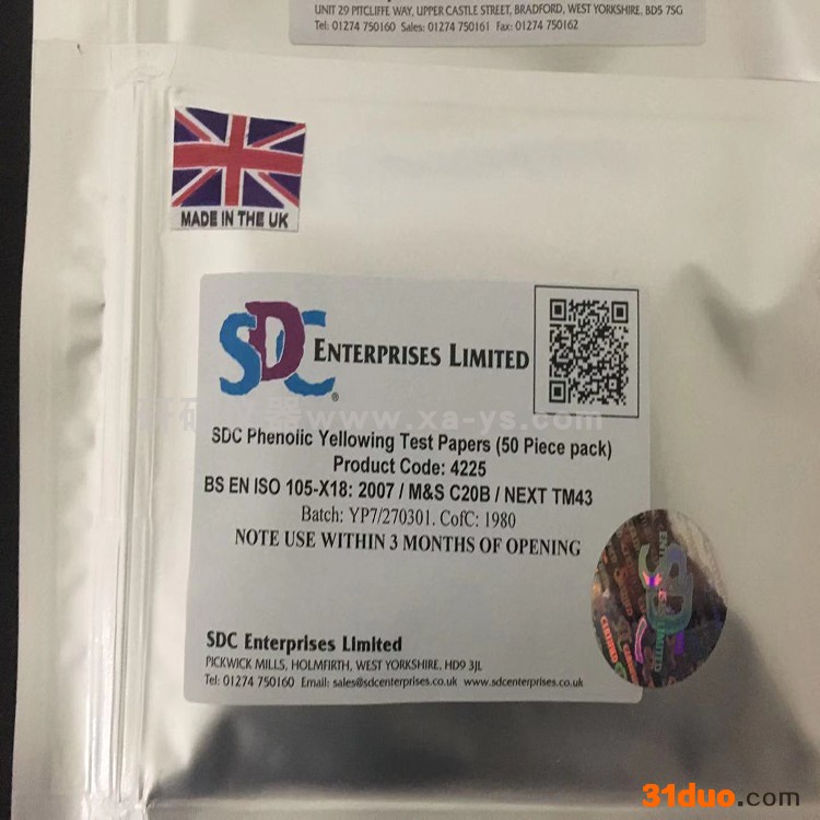 SDC泛黄纸,SDC酚黄测试纸,SDC泛黄测试纸,英国进口酚黄变纸厂家 酚黄测试纸用于评估在运输和储存过程中纺织品泛黄的概率。适用于白色或浅色纱线,织物或经过后整理的成衣。 本试验仅适用预测与氧气或氮气反应引起的泛黄,但不适用其它原因造成的泛黄,如光照褪色,烟气褪色等诸如此类的原因。 可非常有效地控制白色或浅色织物的质量,