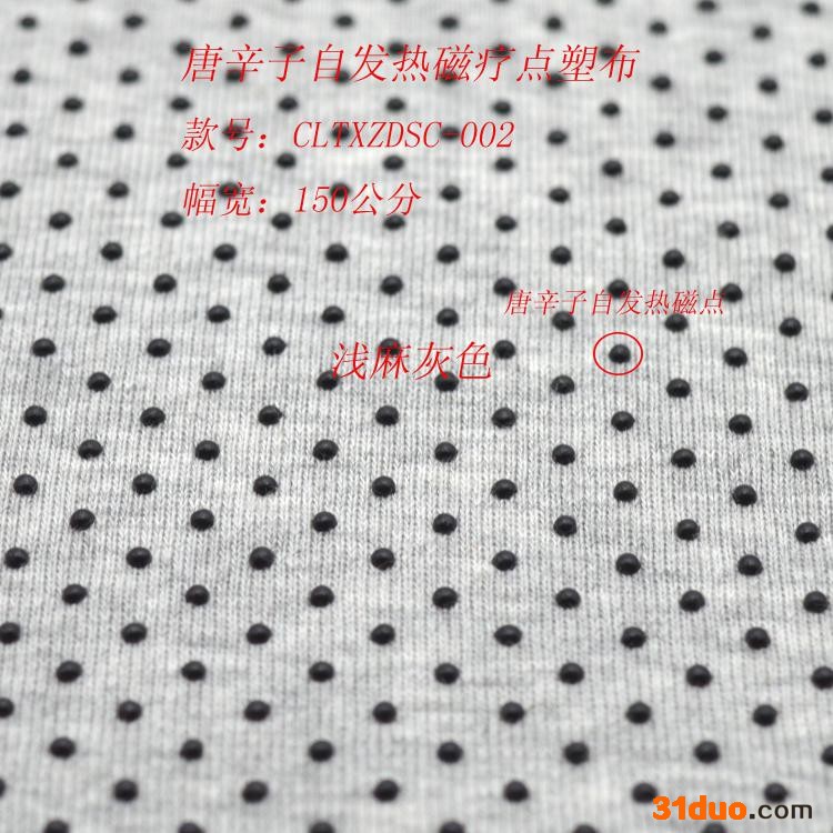 r 触屏牌唐辛子自发热磁疗点塑布,负离子按摩点棉布,托玛琳远红外按摩点针织棉布,发热内衣,发热按摩鞋垫等服饰用布,自发热布rrr rrr 本品是一款复合唐辛子自发热、磁疗、负氧离子功能为一体的针织面料。被广泛应用在减肥瘦身腰带、高腰瘦身内裤、保暖服装内衬等产品上。rrr 本品是在唐辛子棉针织布上面涂塑上按摩磁点,按摩磁点里面含有磁性材料、负氧离子、唐辛子等多种组分。达到了按摩瘦身,有氧运动,燃烧脂肪等减肥瘦身的目的。rrr 研究证明唐辛子能活化交感神经系統,加速新陈代谢及脂肪的分解燃烧,释放能量,其可以吸湿散热、提高人体表皮血流量的功能,活化组织细胞,促进血液循环,提高人体免疫力,人体穿着时体感温度明显升高,具有优异的保健性,保暖效果 。rrr 中华医学巨著《本草纲目》倡导“人要多接受地气,可延年益寿”。其中的地气指的便是地磁。我们人类生活在被地磁包裹着的地球空间环境里,无不受地磁的影响。人体也具有着生物磁场,地球磁场虽然看不见摸不着,但它却关系到我们每个人体细胞的新陈代谢。地磁或外界磁场的变化都会影响人体的生理机能。目前地磁只有0.35—0.5高斯左右,然而城市里的高楼大厦等各种类型建筑屏蔽和减弱了地球磁场的作用。地磁的缺失会使人体细胞新陈代谢紊乱,提前衰老,严重影响人类健康。rrr 人体衰老与人体细胞的衰老有关。当人体细胞缺磁、缺电,缺氧,人体的细胞**会早衰。因此要想延缓衰老的速度**必须对人体细胞进行人为的补充人体细胞的磁、电、和氧,恢复到原有的健康的活力。rrr 此款产品同时给你磁和氧的补充。通过日常服饰的穿着缓慢的改善细胞的机能!rrr