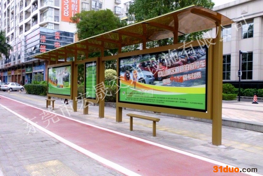 r 公交候车亭一般是与公交站牌相配套的,为方便公交乘客候车时遮阳、防雨等,在车站、道路两旁或绿化带的港湾式公交停靠站上建设的交通设施。东莞市宏晟交通设施有限公司,欢迎热线了解与订购:梁先生 13129478085 QQ2805239201 由于城市公交的日益发达,候车亭已发展成为城市一个不可或缺的重要组成部分,设计精美的候车亭也成为了城市一道美丽的风景。 一般候车亭主要由支柱、顶棚和隔板组成,也有用广告灯箱更换隔板的。