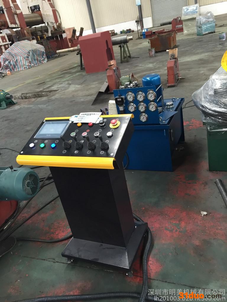 r rrr 一、用途说明rrr 本设备为对称上调式三辊卷板机,用于在常温下弯卷一定厚度的金属板成筒状.弧形等零件。其工作原理是旋转式弯曲变形。是化工.水泥.造船.锅炉.航空.水利.输变电铁塔等机器设备制造行业的必备设备。rrr 二.结构与传动rrr 2.1主要部件rrr (1)、上下辊:为卷板机的重要部件,材质为精制锻件,粗车成形留有加工余量,经调质处理HB240~280,再进行精加工**辊面淬火HRC40~45。rrr (2)、机架:分左右机架各一件,为钢板焊接结构件,经祛除焊接应力处理,机架有下辊轴承。机架内部有方扣丝杆,丝杆上端与上辊两端轴承座相铰接。在其下部装有蜗轮副和螺旋副。靠蜗轮中螺母旋转使上辊上升或下降。rrr (3)、支撑辊装置:用于下辊中部的支撑,提高下辊刚性从而提高工件成形精度。rrr (4)、减速机:主副减速机均采用圆柱齿轮减速机。与垫高一同安装在工作底座上。rrr (5)、卸料平衡装置:装于减速机一侧用于卸料时平衡上辊。rrr (6)、翻倒机构:装于倒头侧用于倒头的翻转及恢复。rrr (7)、底座:为整体底座,便于安装和起吊。由型钢与钢板焊接而成,经祛除应力处理。将机架、减速机、电机等都安装在其上面,从而形成一个整体。rrr (8)、电气部分:采用三相380V/50Hz交流电源,一台主电机驱动下辊旋转,一台副电机驱动上辊升降。本机控制电器均安装在操纵箱内,具有短路过热保护。电柜可根据操作需要进行摆放,操作方便rrr 卷板机卷轴镀铬在卷制不锈钢材料时,可有效的防止不锈钢表面划伤和渗碳!rrr