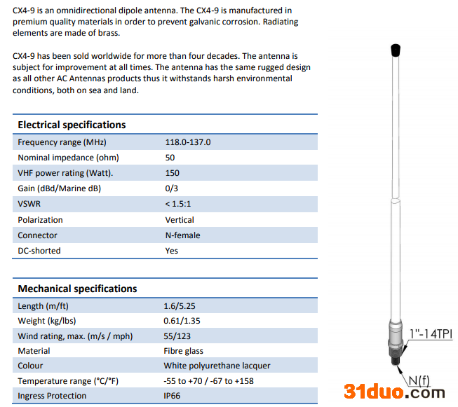 CX3 5/8It is designed for high performance power boats, fishing and commercial use. It provides 3dB (6 marine dB) gain for maximum performance.