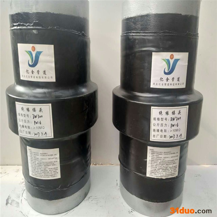 绝缘接头是对同时具有埋地钢质管道要求的密封性能、度性能和电防腐蚀所要求的绝缘性能的管道接头的统称。它包含组合件、绝缘板、填料、密封环、短管等。 绝缘接头,是在相接两钢轨端部放置轨端绝缘件,而槽型绝缘板夹装在接头两侧,两块鱼尾板安装在绝缘板的凹槽内,然后用高强度螺栓贯入接头预留孔拧紧而成。种绝缘板是网状玻璃布槽型绝缘板,它的、三、五、七层为糊状绝缘胶,第二、六层为网状玻璃布,第四层为加厚玻璃布;第二种绝缘板是电热片槽型绝缘板, 河北亿金管道制造有限公司坐落于盐山县五里窑工业区,地理位置十分优越,环境优美,人杰地灵,交通很便利。我公司将凭借良好的信誉,雄厚的实力,良好的产品服务于广大新老用户。多年来,我公司生产的绝缘接头、绝缘法兰、保温钢管、涂塑钢管、阻火器、补偿器、过滤器、防水套管、收发球筒等管道配件,广泛应用于石油、化工、电力、冶金、机械、造纸等行业和领域,深受新老用户的赞誉和信赖。我公司将本着以信誉为本,不断追求技术创新的经营思路,对产品质量和各项服务恪守合同承诺,并愿与新老客户精诚合作,共创未来。