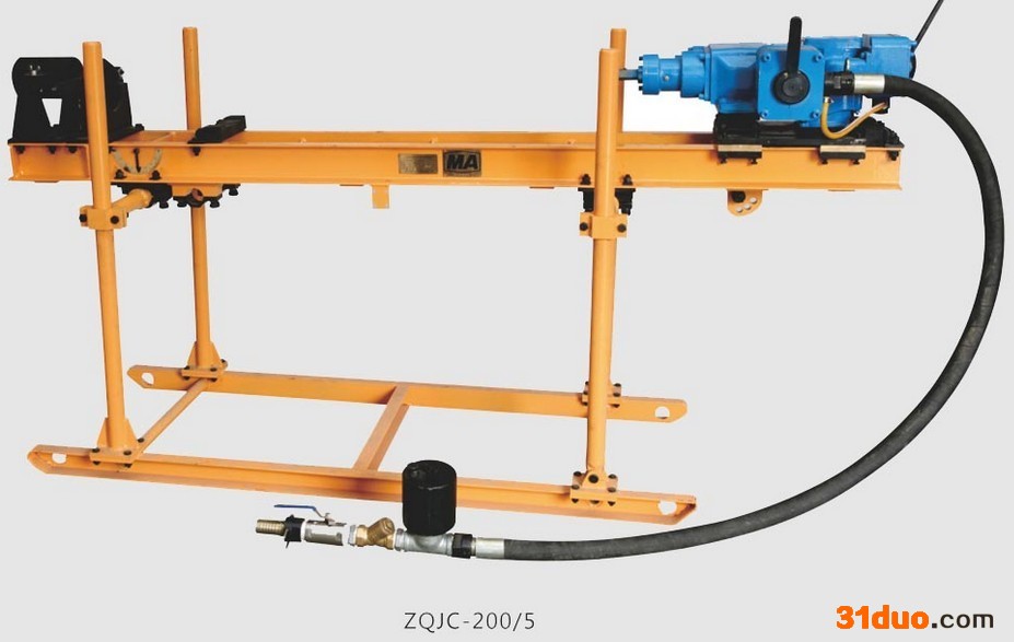 气动架柱式钻机rrr ZQJC-200/5气动架柱式钻机是专门为瓦斯浓度高且井下不易使用电源的巷道设计,该机为气缸顶紧,带有正反转,由气马达带动齿条来进给和后退,大大降低了工人的劳动强度。