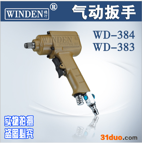 台湾A.WINDEN稳汀WD-384气动双环冲击扳手 气动套筒扳手 扳手维修配件**】 WD-384/383双环冲击扳手/双锤扳手 入气压力…………6.5kg 空气消耗量…………9CFM 进气接头………………1/4″PT 螺栓能力…………………16mm—15mm **大扭力……………………350NM—150NM 无负荷转速……………………7500R.P.M 入气管径…………………………1/2″ 尺寸…………………………………1/2. 3/8″方头 重量……………………………………1.6kg 特点:小型、轻型、强力、空气调整阀内附、容易调整、主轴采用鎳铬钼合金钢一體成型、采用新双锤结构提升扭力,增长寿命,上排氣,下派氣可根据需要逻辑。 适用范围:航天航空、汽车、火车、船舶及大型机械组安装维修和用于工业及一般生产线的装配和维修。