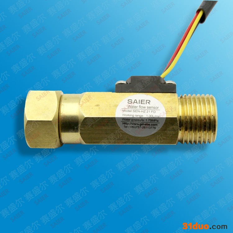 SEN-HZ21FD款参数:4分管, G1/2外牙入水,G1/2内牙出水,内牙为可活动内扣式,一字型结构,黄铜,规格:27*75mm(直径*高),内牙进水,外牙出水,防水防爆,耐热耐冷,4分铜水流量传感器,可用于售水机、热水器、太阳能、热泵、空气能等水加热和水计量,电热水龙头用水流传感器,淋浴房刷卡系统用水流量计,水控机计量水流传感器,热水器水流传感器,壁挂炉专用水流量传感器, 可作水流开关使用,同时也可用来计量流量和流速,计量准确,三线:红色为正极,黑色为负极,黄色为脉冲信号**大压力1.75mpa,流量1-30L/分。可配温度控头,连接线的长度和连接端子的类型可根据客户要求来设定。