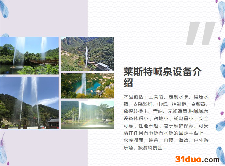 喊泉是一种新型的娱乐项目,它是通过人类发声的高低、时间的长短来决定喷泉的喷射高度和持续时间长短。在喷射的同时有一种汽笛的鸣叫声,是一种极其有趣味的水上项目。能极大吸引游客的好奇之心,同时也是释放工作压力的一种形式,锻炼了人的肺活量,促进肺部血液循环。来吧,吼上几声,健康长寿! 位于郭亮村西南2000米处,在一个窑龛的绝壁上,一股清泉呈喷淋状落下,泉眼距地面20多米。相传,七仙女来此游玩,向龙王要水沐浴,龙王急忙拔下几根髯须粘在石壁腰间,形成天然喷淋,水量受声音影响,喊声大水量**大,喊声小水量**小,由此得名喊泉,又称龙须泉。泉下有一块凸立的石头。四周长着青苔,称为仙女浴台。 民谣:仙山浴台临风站,喊却龙王掷须髯。一束银丝挂半壁,天然喷淋声控关。 喊泉又称声控喷泉、呐喊喷泉,是近来新兴流行喷泉的一种,声控喷泉是喷泉安装了声音控制系统,当人通过麦克风输入声音时,声音会转化为信号传输给控制系统,再由控制系统来控制喷泉水柱的高低。景区或者公园的响泉你见过吗?每当有人走近并大声吼叫时,泉水**会喷涌而出,喊的声音越大,泉水喷射的**越高。 喊泉是一种新型的娱乐项目,它是通过人类发声的高低、时间的长短来决定喷泉的喷射高度和持续时间长短。在喷射的同时有一种汽笛的鸣叫声,是一种极其有趣味的水上项目。能极大的吸引游客的好奇之心,同时也是释放工作压力的一种形式,锻炼了人的肺活量,促进肺部血液循环。