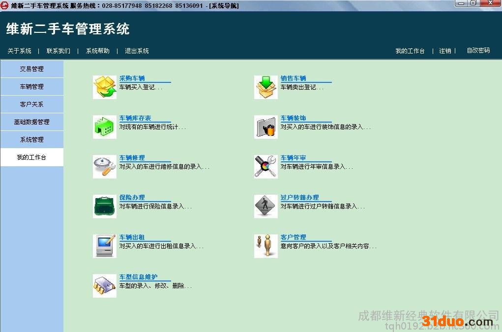 维新二手车管理系统:是根据繁荣的二手车市场应运而生的,系统根据二手车的实际业务,将二手车的“采购和销售”,“车辆库存”,“客户关系”以及库存车辆的“装饰、年审、维修、保险、过户、出租”等业务联系起来,实现实时高效的科学管理。软件系统操作灵活、简便,与任何财务软件都可以进行数据倒入,并可以根据用户的要求进行个性化修改。真正做到省时、省力又省心,让管理更轻松! 业务全面流畅:系统包括二手车的“采购、销售、库存、客户”等全面的管理模块,实现了业务的流畅管理。 报表详尽准确:强大的报表功能.对数据进行准确分析,汇总。信息详细、准确、专业。 客户管理人性化:记录客户详细资料和购车意向、收集反馈信息、提醒业务活动、客户生日等,实现人性化的客户关怀管理。 权限控制严格:采用三级权限模块做到权限限制更加**。 数据查询方便:多人同时使用,数据共享,报表统计查询方便。 软件功能详细介绍网址:http://www.weixinsoft.cn 软件试用下载、远程安装培训咨询电话:028-85171841