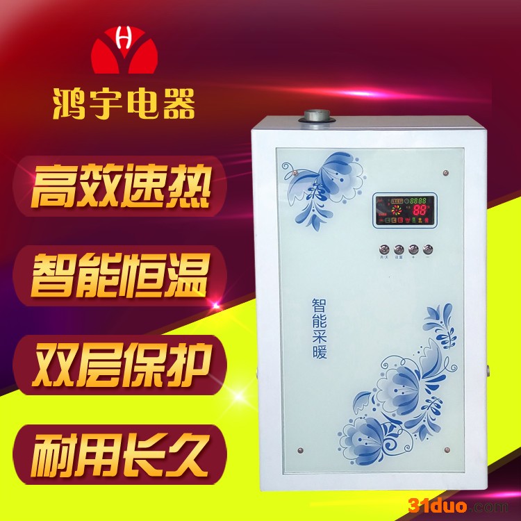 鸿宇微电脑全自动电磁感应变频节能电采暖炉 智能、洁净、速热、无烟、方便、安全,省心省力。 主要适用于:工厂、学校、宾馆、酒店、医院、温棚、行政单位、门店、办公室、别墅、住宅小区、洗浴中心、游泳馆等的采暖及水的加热。 面对市场加热方式不同,价格参差不齐的电采暖炉,您是否无从下手?价格高低是小,一旦选择了质量不过关,有严重安全隐患的产品,将会危机人身安全和造成财产损失。沧州鸿宇智能电器有限公司是一家集研发、生产、销售于一体的高新技术公司,是国内拥有双层变频加热,自主研发生产技术的公司。公司生产的智能变频电磁采暖热水炉,是您采暖洗浴的选择。适用于:厂房、学校、宾馆、门店、办公室、别墅、洗浴中心、居民等采暖和洗浴。 为什么要选择鸿宇变频电采暖热水炉? 1、人的生命是宝贵的,我们的产品安全。鸿宇变频采暖热水炉,是真正的变频电磁感应加热,真正的水电分离。产品不用防电墙和漏电保护开关,这才是真正的安全,不信,你问问其它厂商的电采暖炉,敢不用防电墙和漏电保护开关吗?本产品智能全自动温控运行,避免了然气和煤气中毒及电热棒漏电等不安全因素。 2、电磁感应双层加热体,是目前国内先进的加热技术,变频加热体采用高精度磁性不锈钢材质,循环水被磁化,不结水垢,使用寿命长,核心电路采用德国进口的IGT大模块,比电热管,电热棒等加热方式节能。 3、升温速度快,开机5分钟左右,出口水的温度达60度,即开即热,温度随意调控,采暖不干燥,空气湿润更舒服;定时开机关机多个时间段,省心省力, 4、产品安装简单方便,接上出水管、回水管,加上水,接上电源,开机运行即可工作。内置低压保护、高压保护、短路保护、干烧保护、超温保护、防冻保护功能、让您安全无忧。 鸿宇智能型家用电采暖炉有壁挂和落地两种款式 微晶面板,美国原装进口微电脑芯片,智能遥控控制,鸿宇电采暖炉设有双重漏电保护和防干烧保护 中型机尺寸:高61cm宽39cm厚21cm 鸿宇智能遥控电采暖炉核心特点: 1.安全性 鸿宇产品机内采用美国原装进口微电脑芯片,智能遥控控制,设有双重漏电保护和防干烧保护。同时具有体积小、重量轻、操作简单、安装方便等优点。鸿宇电采暖炉设有双重漏电保护,防干烧保护,不污染室内空气,超温报警,安全干扰。 系统采用无压运行,滚动分级加热,启动电流小,对电压变化无要求,系统具有各种安全保护功能和装置,产品通过安全检验部门的严格检验,为人身和产品的安全提供了可靠保障。