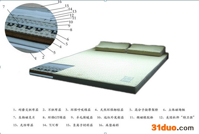 磁疗床垫是具有磁疗功能的功能寝具,是市场兴起的一种有助眠作用的家居床上用品,磁疗床垫的材质和工艺与普通床垫有很大的差别,隽和磁疗床垫采用自主研发技术,厂家直供,更有贴牌代理,产品升级等服务。