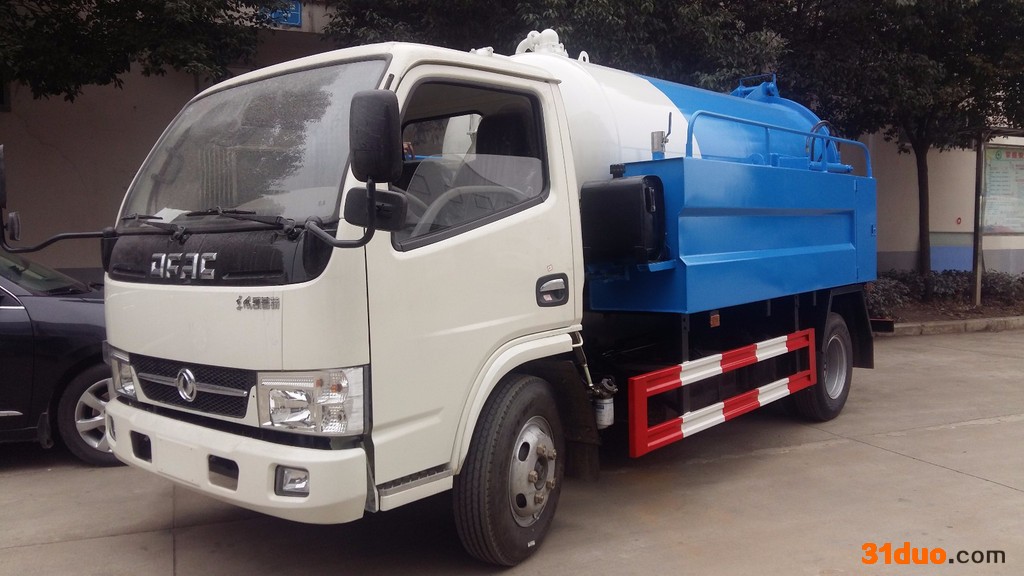 东风多利卡清洗吸污两用车,。采用东风国五原装底盘,加装高压水罐、高压水路系统、吸污罐、吸污管、吸污管道系统、液压放管器、洗管器、液压绞盘和液压系统改装组成,高压水罐和吸污罐均置于汽车底盘上,缠绕在液压放管器上的高压水管和洗管器的进水口经高压水路系统与高压水罐相连,吸污罐由罐体、罐门和罐门夹紧机构组成,吸污管与吸污罐相连,吸污罐与具有抽真空作用的吸污管道系统相连,液压绞盘置于汽车底盘尾部,其上缠绕钢丝绳。