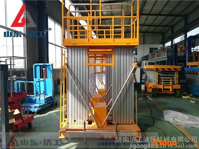 r r r 该产品适用于各行业高空设备安装、检修等可移动性高空作业。根据不同要求可选择不同动力形式(如:三相交流电源、单相交流电源、直流电源和内燃动力等),加配上手动液压装置,可在停电或无电源场所照常升降工作,并可加伸缩平台,在平台长度不足时可延伸至所需位置,从而提高工作效率。是现代高大建筑、设备之理想配备产品,是高空安全文明生产之必备。除作为不同高度的货物输送外,广泛应用于高空的安装、维修等作业。升降台自由升降的特点已经广泛运用于市政维修,码头、物流中心货物运输,建筑装潢等,安装了汽车底盘**底盘等能自由行走,工作高度空间也有所改变,具有重量轻、自行走、电启动、自支腿、操作简单、作业面大,能跨越障碍进行高空作业等360度自由旋转优点。该系列产品为室内型,广泛适用于星级酒店,大型超市等各行业大厅、厂房内的高空作业, 具有升降平衡,操作方便,能进入一般门厅,可随意进出电梯且耗电少、无污染、工作时不伤 地面,可用于 贴墙工作及探出作业,工作无死角。单立柱式铝合金电动升降机配上龙门跨架附件,非常适合于影剧院、会堂、教堂等的维修工作r r r 温州【济南济工】大型升降机**价格-济工机械r rr