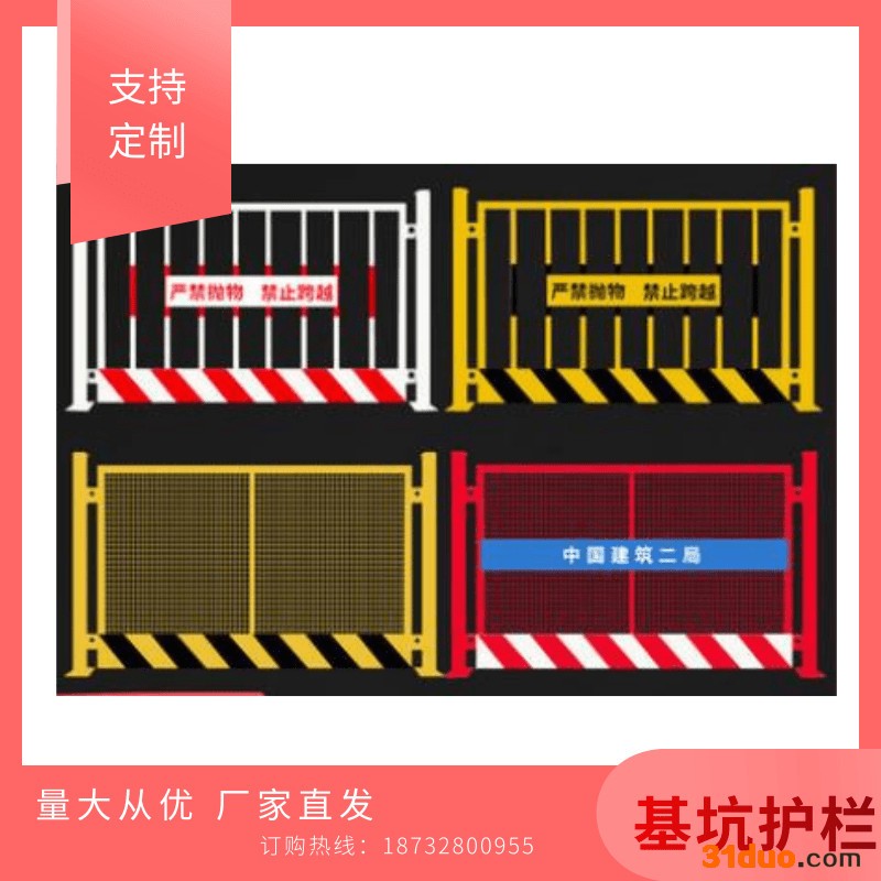 基坑护栏网标准: 1、开挖深度超过2m 及以上的基坑周边必须安装防护栏杆,防护栏杆的安装应符合规范要求; 2、基坑内应设置供施工人员上下的专用梯道。梯道应设置扶手栏杆,梯道的宽度不应小于1m,梯道搭设应符合规范要求; 3、降水井口应设置防护盖板或围栏,并应设置明显的警示标志。 4、基坑护栏网栏杆高度不宜低于1.2m,立杆之间不宜大于2m。基坑护栏有很多种,一般使用比较醒目的红白和黑黄颜色。3、栏杆柱的固定及其与上、下横杆的连接,其整体构造及强度应经受1000N外力;若可能有车辆或物体碰撞,则应加大横杆截面或加密栏杆柱的间距及埋置深度等措施。 5、护栏外侧还可以悬挂13号提示牌,内侧悬挂14号提示牌,比如常见的警示语:安全生产,人人有责;基坑危险,请勿靠近等等