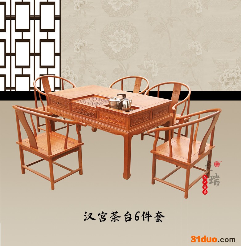 产品详细 【型号】ZR-055 【名称】汉宫茶台6件套 【结构】精雕 榫卯 精巧手工工艺 【材质】缅甸花梨木(大果紫檀) 非洲黄花梨 【颜色】原木色/金黄色/金黄色偏红/老红木色等,也可按照客户要求上色。 【产地】浙江省东阳市--中国木雕城 【包装】汽泡+纸板 【周期】现货1-2天发货 【运费】到付 【规格】 桌:148*88*78高 椅:61*47*41高*91靠背 主要产品类别: 客厅系列:休闲椅,中堂,沙发,花架,条案,供桌,神台,玄关,电视柜 餐厅系列:餐桌,茶水柜,茶桌,酒柜,备餐柜