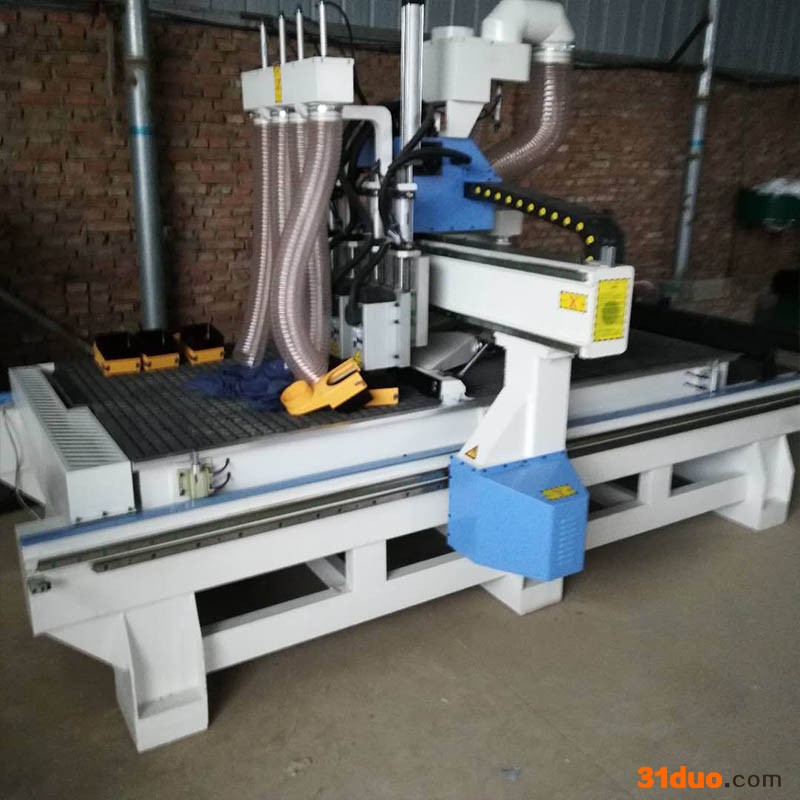 全自动四工序雕刻机 设备特点 1.三个机头交替工作,省去了中间人工换刀的烦锁,工作效率高。 2.部件优良:采用台湾产直线导轨,德国产滚珠丝杠。 3.设计合理:独立电脑操作机柜,使用维护方便。 4.性能无忧:拥有断点续雕、断电恢复、加工时间预测等功能,真正人性化设计。
