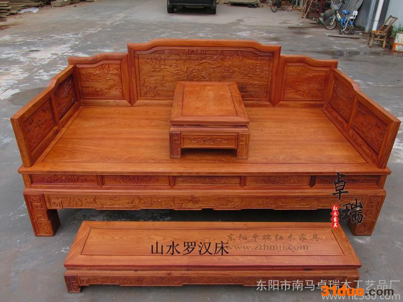 产品详细 【型号】ZR--037 【名称】山水罗汉床(配坐垫) 【结构】精雕 榫卯精巧手工工艺 【材质】缅甸花梨木(大果紫檀) 非洲黄花梨**紫檀) 【颜色】原木色/金黄色/金黄色偏红/老红木色等,也可按照客户要求上色。 【产地】浙江省东阳市--中国木雕城 【包装】汽泡+纸板 【周期】现货1-2天发货 【运费】到付 【规格】 床:200*100*48/98总高 炕几:82*40*22 脚塌:160*30*20