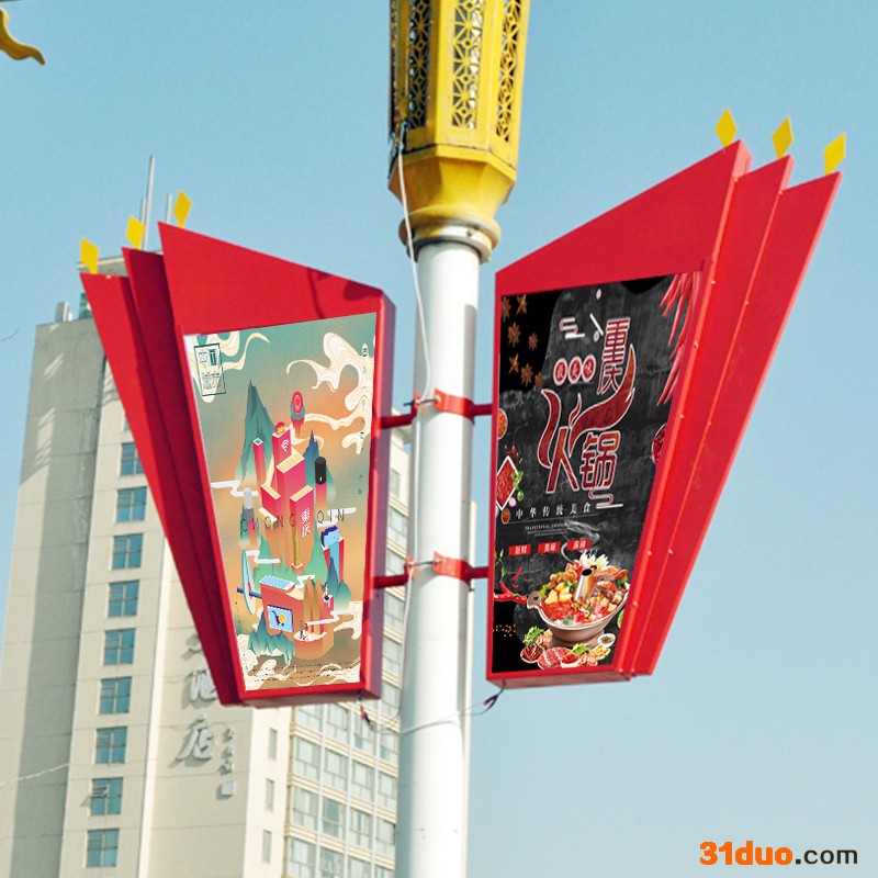 衡阳灯杆道旗灯箱是安装在路灯杆上像旗帜一样的广告灯箱又称灯杆广告牌画面可以发光