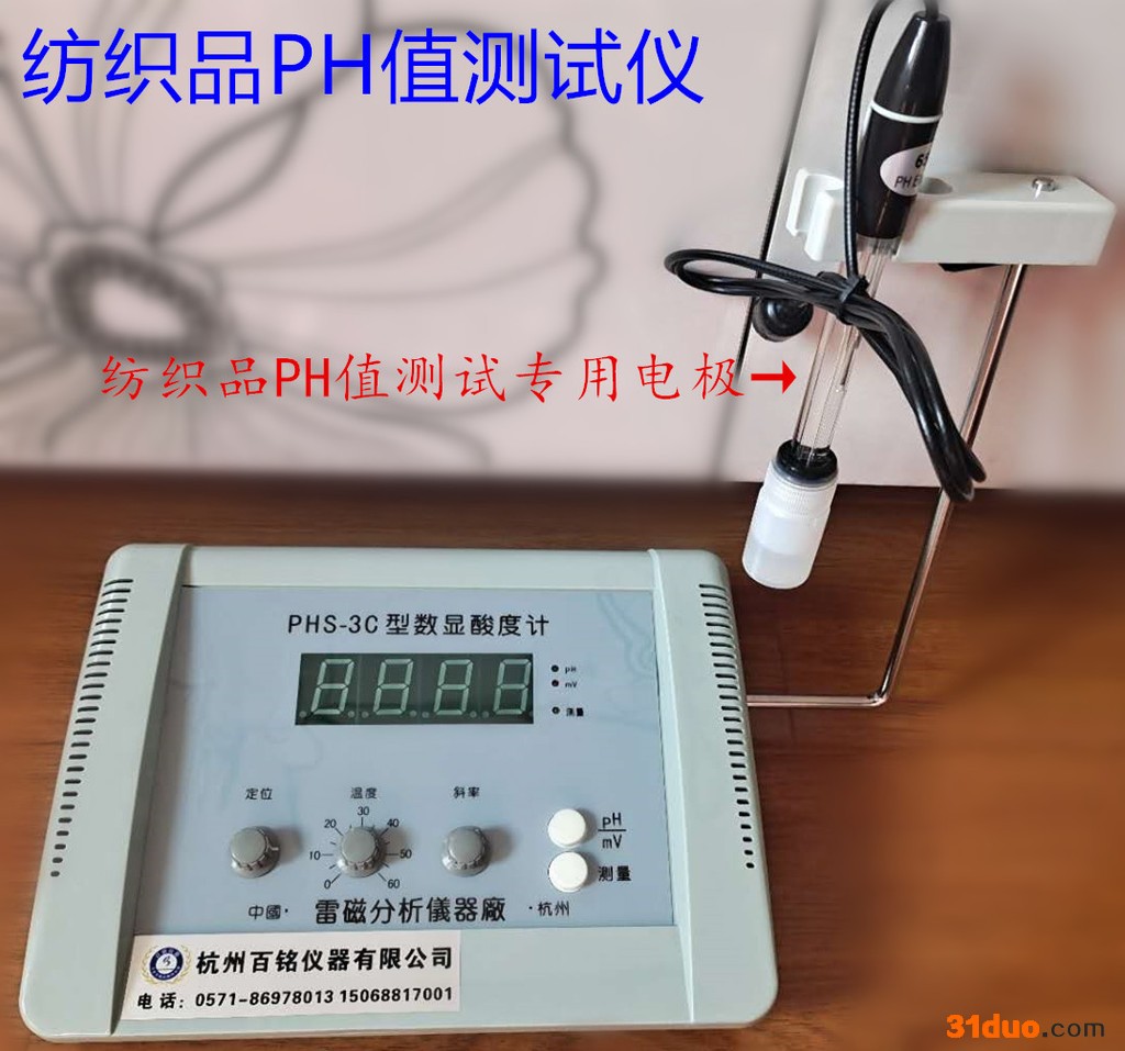 【使用范围】:主要用于印染、服装、面料、床上用品等纺织品的酸碱度测试。 【符合标准】:GB/T18401、GB/T7573等 【技术参数】: 1.PH测量范围:0.00-14.00PH 2.分辨率:0.01PH 3.精度:±0.01ph 4.Mv测量范围:±1999mv 5.精度:±1mv 6.温度范围:0-100℃ 7.PH校准点:2点