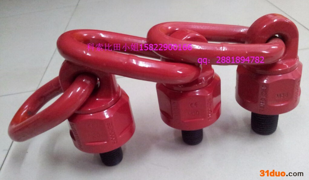 重中之重**是,旋转吊环--“相对于价值十万元乃至上百万元的重型设备来说,吊环、链条等吊具可谓是细小的部件。但是,俗话说得好“细节决定成败”,越是微小的环节,越是不能“吊”以轻心。天津科索比(品牌倍力特)从进料到加工,从仓储到运输,一切品质无不与这些不能“吊”以轻心的细节息息相关,为重型设备的起重、运输提供安全保障。 我要强调我们的起重吊环或者有人叫它旋转吊环都是锻造的,是锻造的。一步两步、一步两步、一步一步是锻造的。也许您要问,WHAT IS 锻造?锻造是一种利用锻压机械对金属坯料施加压力,使其产生塑性变形以获得具有一定机械性能、一定形状和尺寸锻件的加工方法,锻压(锻造与冲压)的两大组成部分之一。通过锻造能消除金属在冶炼过程中产生的铸态疏松等缺陷,优化微观组织结构,同时由于保存了完整的金属流线,锻件的机械性能一般优于同样材料的铸件。相关机械中负载高、工作条件严峻的重要零件,除形状较简单的可用轧制的板材、型材或焊接件外,多采用锻件。 旋转吊环又称万向吊环或旋转吊环螺丝,用于有角度的特殊起吊场合。能实现水平360°旋转和上下180°翻转。 M8,M10,M12,M14,M16,M20,M22,M24,M30,M33,M36,M39,M42,M45,M48,M56,M60,M64,M72M80M90,较da可以做到M100!!,还可以根据客户需要定做非标吊环,并且常用规格都备有