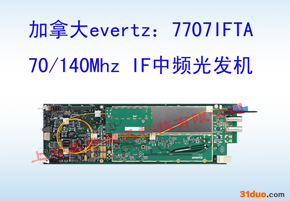 加拿大evertz—7707IFTA70/140Mhz IF中频光发机r代替 7707IFT, 并提供更先进的功能和更大的工作范围。7707IFTA 是一个Vistalink? 兼容的光发射机,用于70/140MHz IF 信号。7707IFTA 接收一路70/140MHz 同轴输入并提供一路光纤输出,范围可在1310nm, 1550nm 或高达16 段的CWDM 波段。同时也提供了 IF BNC 输出以用作监测或信号分配。通过卡边设置或通过Vistalink? 远程控制来实现参数和状态的监控。