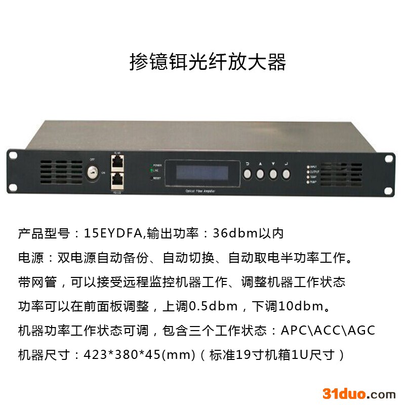 r rrr rrr r r r r r r r r rrr rrr rrr 一、产品概述: rrr rrr EYA8500 系列1550nm掺镱铒光纤放大器是我公司一款技术性革命,他颠覆了以前的泵浦供电和制冷方式,采用全新的方案设计,产品几乎没有热量也没有多余的热量散出,选用国际品牌的低噪声泵浦激光器和高性能掺铒光纤,并内置完善的微电脑自动监控系统,确保了整机优异的性能指标,是大、中型1550nm CATV光纤传输网络的高端首选设备。模块型光放低功耗、外形小、无热量更适合FTTH光纤入户网络使用。 rrr 二、性能特点: rrr 1、选用国际低噪声泵浦激光器,失真低,宽频带,输出光功率高;采用进口高性能铒镱共掺双包层光纤技术,能量转化效率高;内部电路采用先进的SMT生产工艺,可靠性更高。 rrr 2、内置完善的微电脑自动监控电路,能实时精确监控光输出功率和激光器的各种工作状态,确保了稳定的光输出功率,并有效延长了激光器的工作寿命。 rrr 3、输出端口:8-16路可选;输出光功率:最高可达2W的总输出;低噪声系数:0dBm输入时低于5dB; rrr 4、可以阶段调节光输出功率,-4—0.5dbm可调。 rrr 5、19″1U 标准机架,前面板内嵌蓝屏VFD显示屏,能精确显示设备的各项工作状态参数;并配有国标II类应答器,可通过以太网络实现网管监控。 rrr 6、机架型采用双电源设计预留,可以选择双电源DC48VAC220V或AC220V双电源自动备份 rrr 三、技术参数: rr