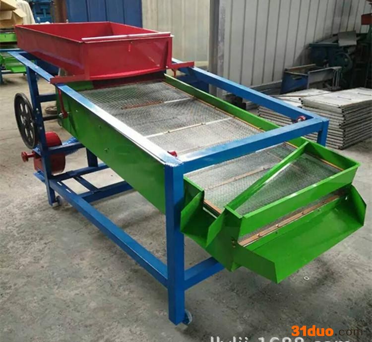 该精选筛为二层筛网,先经过进料口处风机抽风,直接抽走重量轻的杂叶或麦秸秆,上层筛的初次筛分再把大杂清理过,好的粮食(种子)直接落到下层筛网上,下层筛网会把粮食(种子)中的小杂.小石子.有缺陷的粮食(种子)直接漏掉,完好的粮食(种子)会从出料口筛分出来。该小型清粮机解决了扬场机的功能单一,不能有效去除石子.土块的缺陷,更能为清理.净选粮食(种子)带来满意的效果。该机有占地小,移动方便,便以维修,除尘除杂效率明显,能耗低,使用简便等优点。