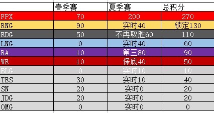春季赛RA和WE仅获得10分,LNG春季赛一分未得。这三支战队成为第二获得110都不会反超RNG现在锁定的130分。EDG如果之后不敌WE/RA胜者,并在败者组第一轮被淘汰,也将锁定积分110,无法反超RNG积分,所以RNG获得二号种子名额。