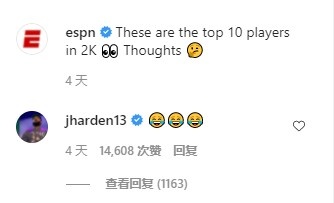 值得一提的是,哈登评论了ESPN制作的2K能力值前十榜单,留下了三个笑哭表情。